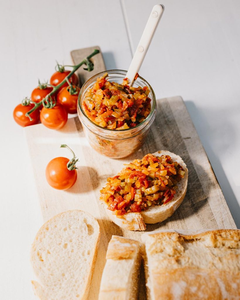 Zuletzt das Relish mit Salz und Pfeffer abschmecken und anschließend in sterilisierte Gläser füllen. Gut verschlossen hält sich das Relish auch über längere Zeit und ist immer griffbereit, wenn Ihr eine würzige Beilage zu Käse, Fleisch oder Brot braucht. Das schmeckt ganz köstlich zum Beispiel auf einem frischen Ciabatta.