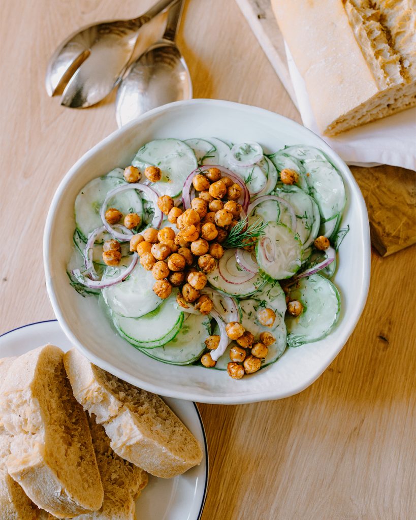 Leicht, gesund und wunderbar aromatisch: Dieser Salat bringt im Handumdrehen Frische auf den Tisch. Die Kombination aus knackigen Gurkenscheiben, mildem Joghurt, frischem Dill und der angenehmen Würze der gerösteten Kichererbsen sorgt für einen harmonischen Mix. Ein ideales Gericht für alle, die den Januar mit guter Laune beginnen möchten.