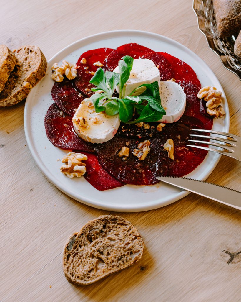 Feierlich, frisch und farbenfroh: Das Carpaccio zaubert Euch ein kleines Stück Winterglück auf den Teller. Die milde Süße der Roten Bete trifft auf die Cremigkeit des Ziegenkäses. Dazu ein Stück aromatisches Nussbrot und der Genuss ist komplett.