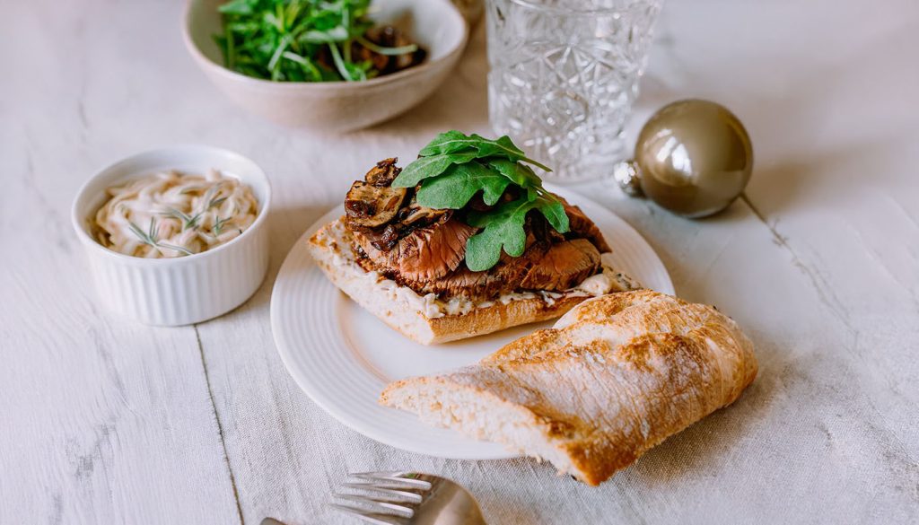 Dieses Sandwich hat alles, was ein kulinarisches Highlight braucht: zartes Fleisch, knuspriges Baguette, aromatische Champignons, eine feine Portwein-Note, frischer Rucola. Ein tolles Gericht für alle, die auch an den Feiertagen gern mal etwas Neues ausprobieren, ohne auf festliche Aromen zu verzichten.