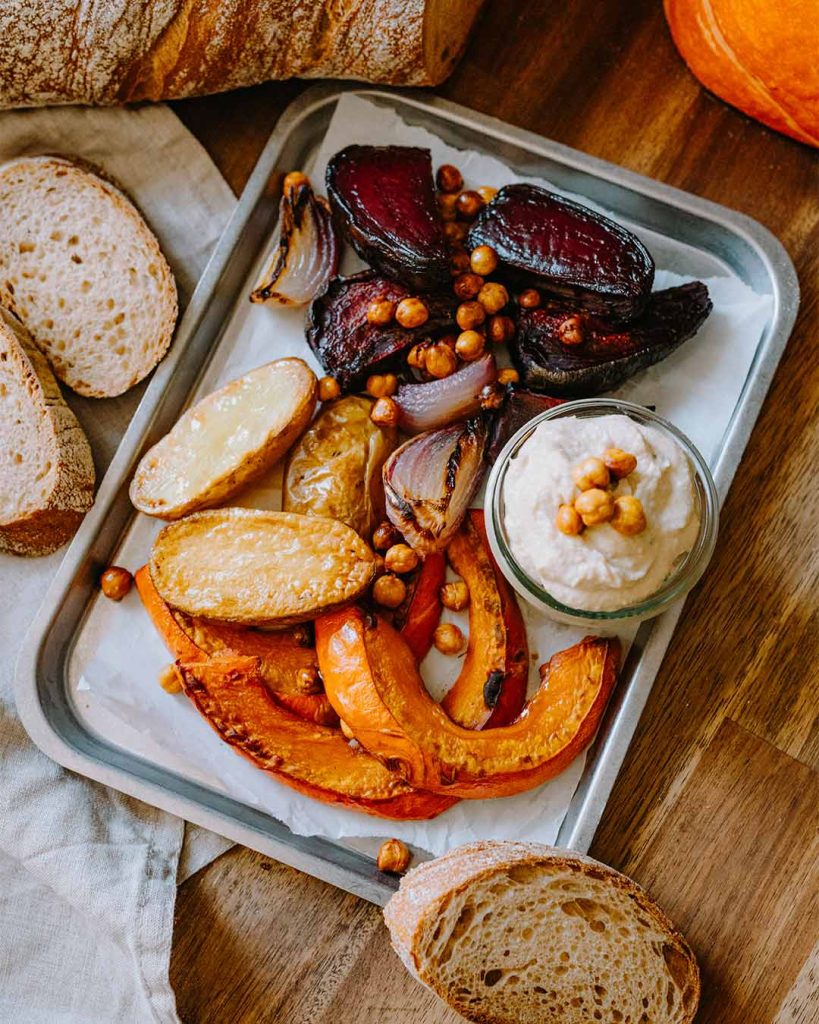 Bunt, würzig, voller Geschmack: Das winterliche Ofengemüse bringt die Vielfalt der Saison auf den Teller. Ein wahres Fest für alle Sinne. Frischer Zitronensaft und cremiger Hummus verleihen dem Gericht den besonderen Pfiff. Mit einer knusprigen Scheibe Brot direkt aus dem Ofen genießen – schon fühlt sich der November goldrichtig an.
